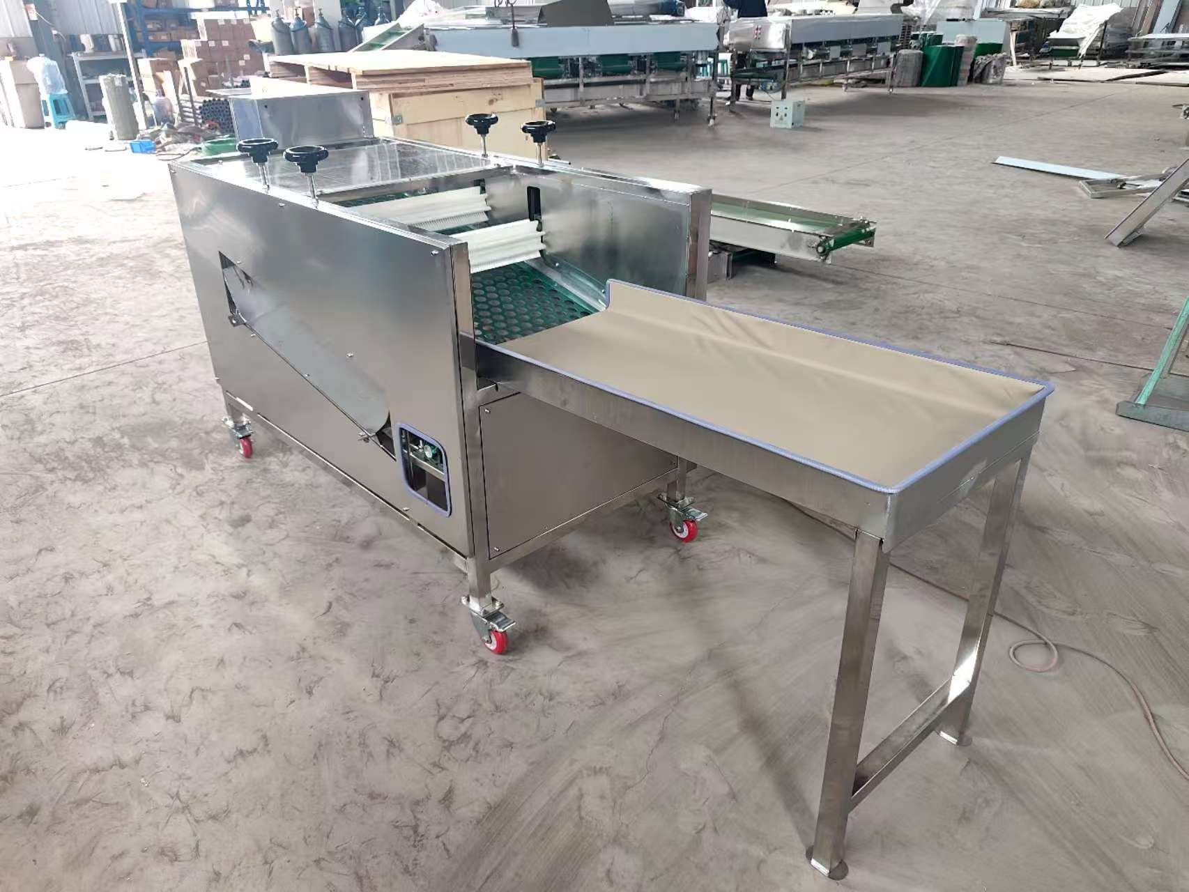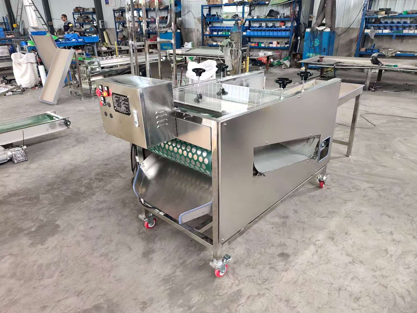 蘑菇根部进入带孔传送带,传送带经过切割部分时,切割器会将蘑菇根部切断。