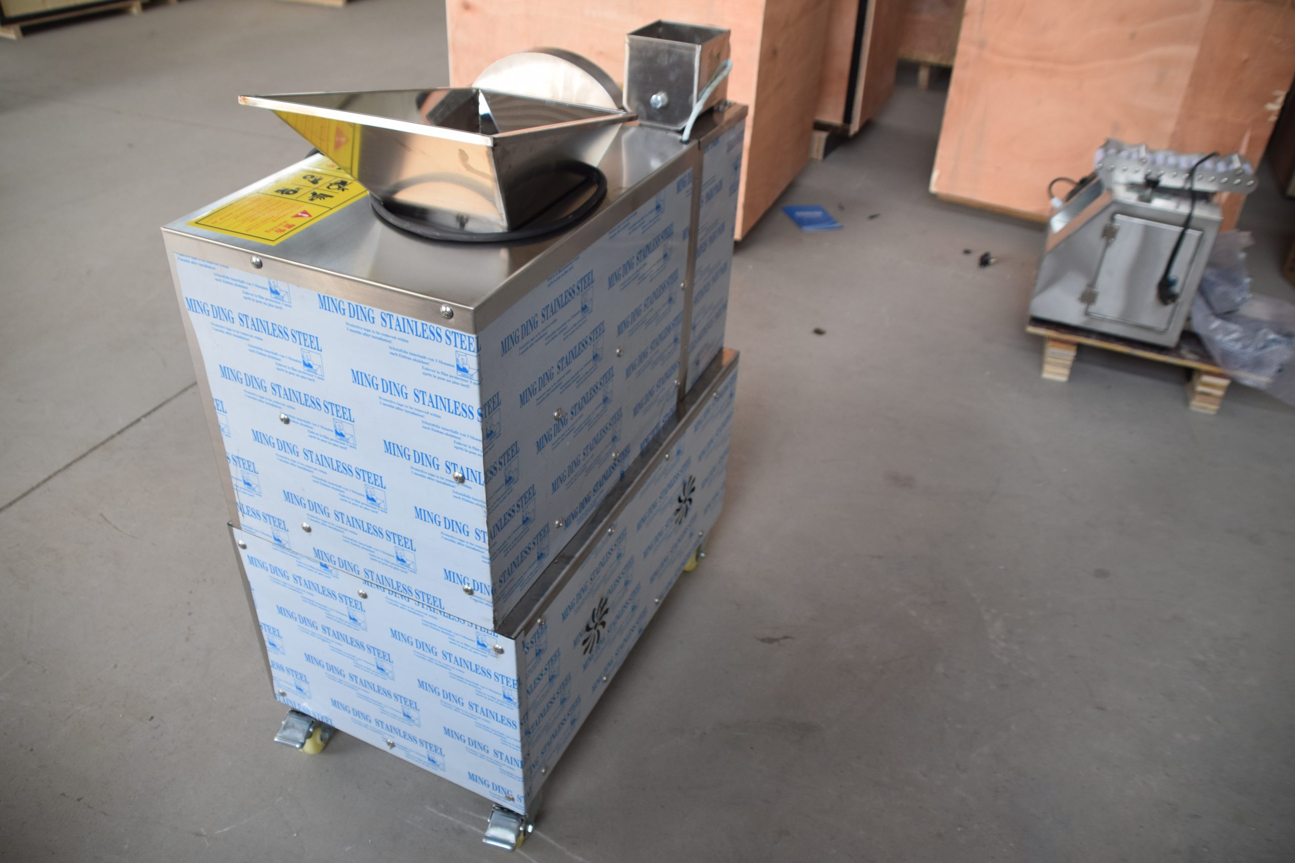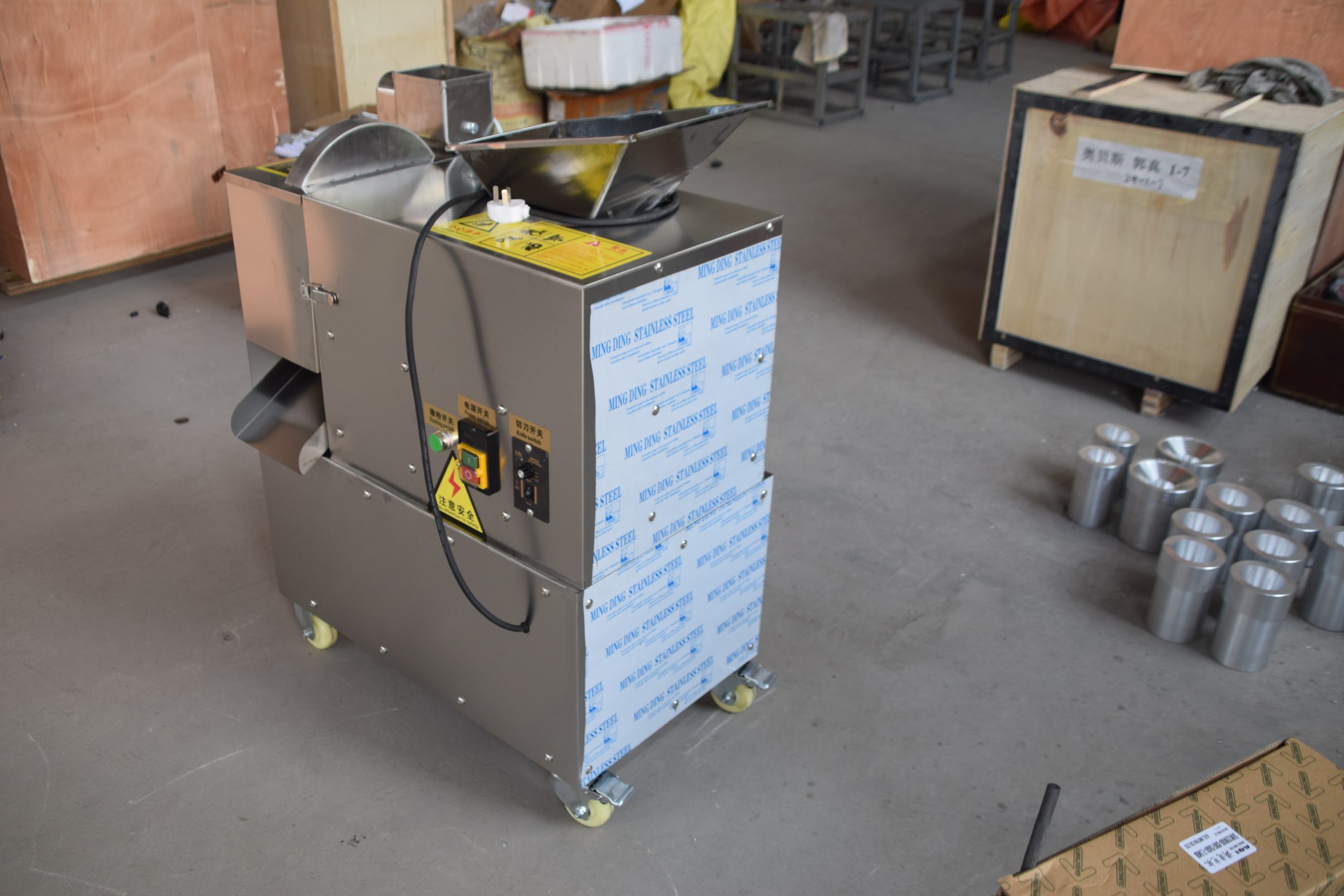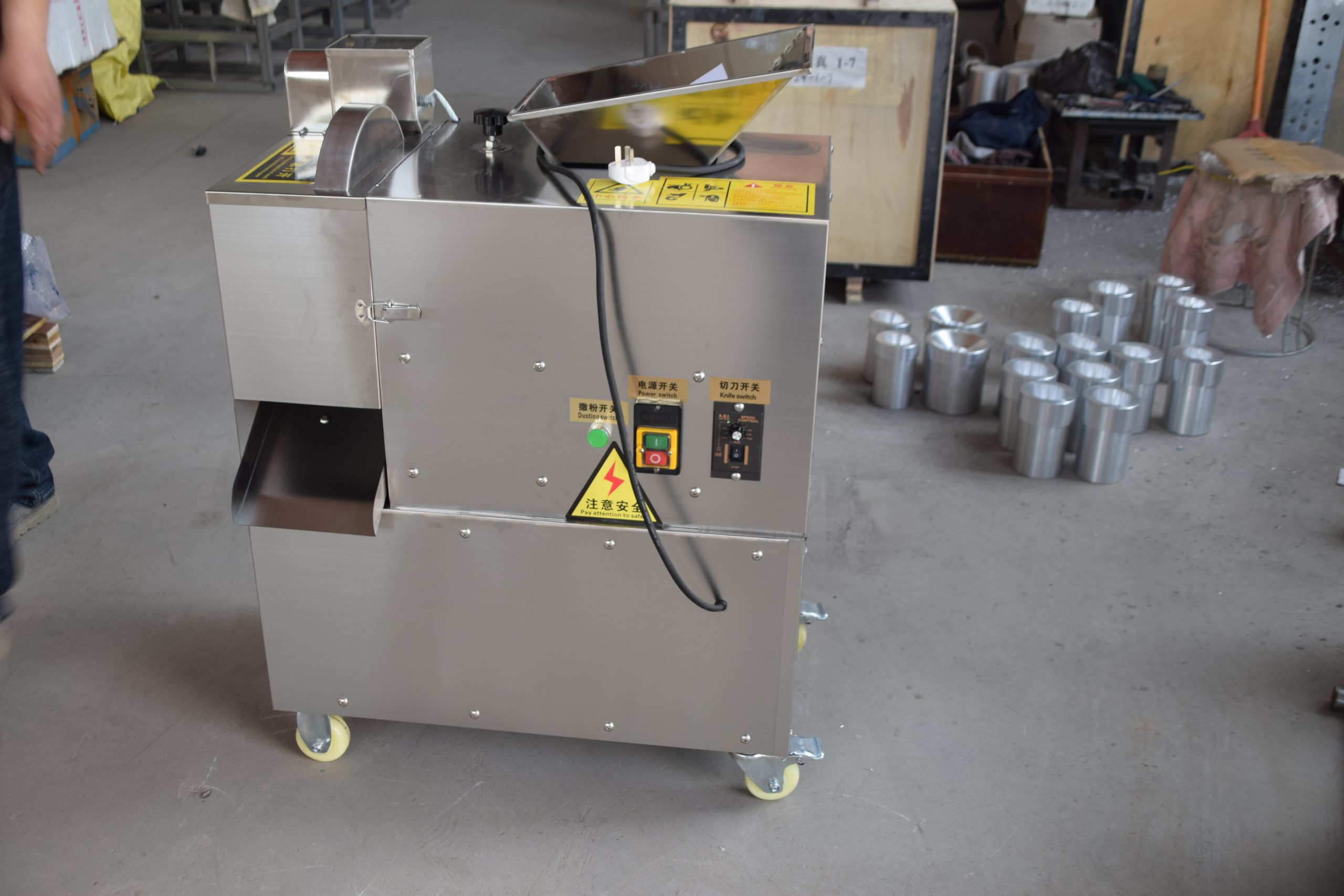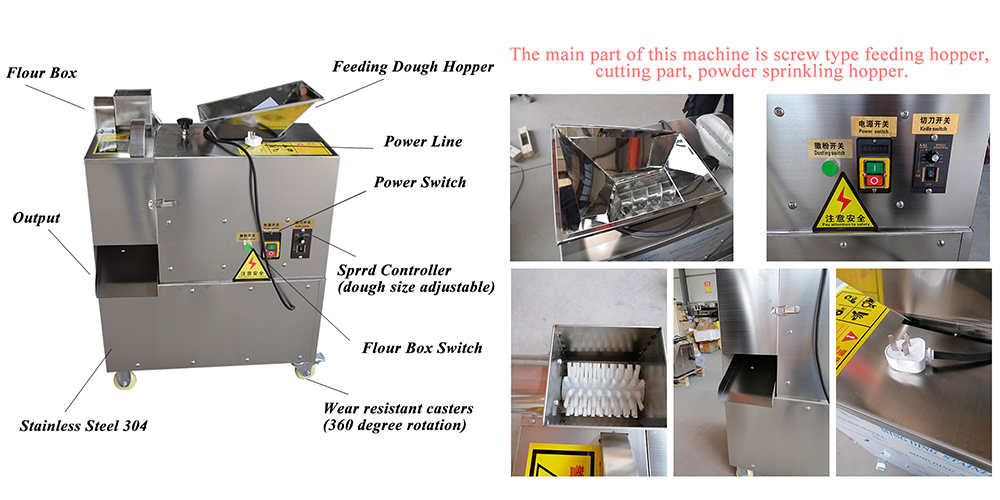 该机器的主要部件包括螺旋式进料斗、切割部分和撒粉斗。