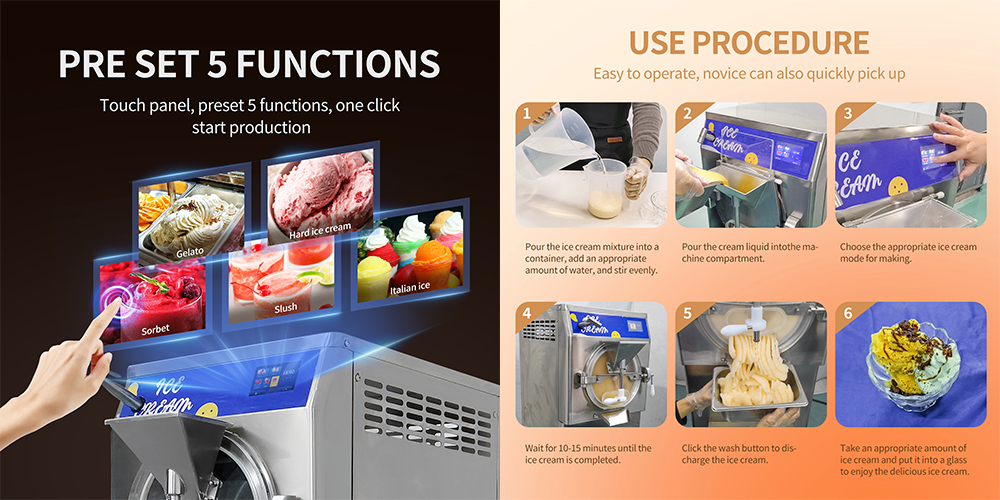 3. 通过设置不同的搅拌时间,机器可以制作硬冰淇淋、雪葩、意式冰淇淋和意大利冰